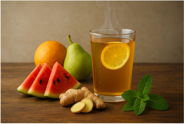 Buah segar kaya air seperti semangka, melon, mentimun, jeruk, dan pir sangat baik untuk menurunkan suhu tubuh dari dalam. Selain itu, kandungan vitamin dan antioksidan di dalamnya membantu mempercepat pemulihan tubuh.
